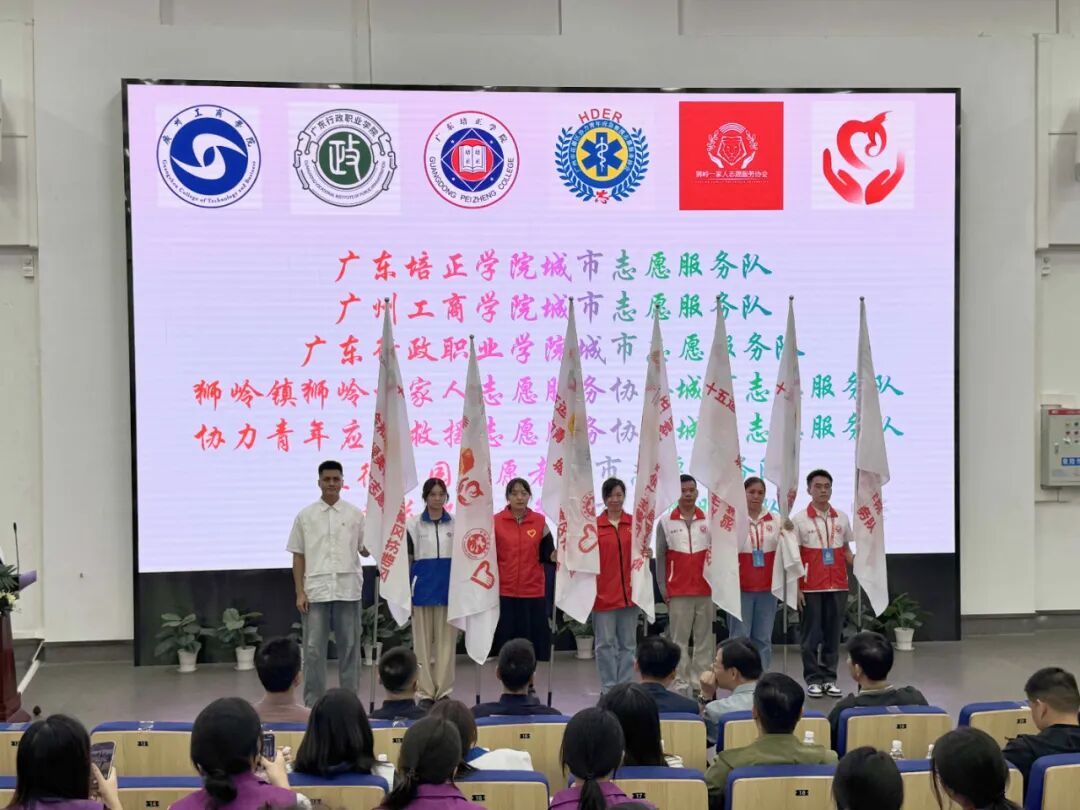 花都区委社工部领导为广东培正学院、广州工商学院、广东行政职业学院以及区协力救援协会、狮岭一家人协会等7支队伍代表授旗,“小海豚”志愿者们接过旗帜、奋力挥扬,展示出花都城市志愿服务队伍的昂扬风貌。